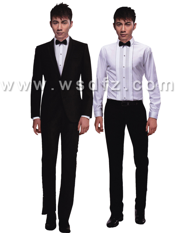 产品描述:白色衬衫搭配黑色西服,再加上领结的点缀,潇洒、大气,突显男士的绅士风度;百分百纯棉衬衣以及全羊毛西服的面料,舒适自然;经典两粒扣,平驳领设计,大气之余不失优雅的本性,是男士参加晚宴无可挑剔之选。